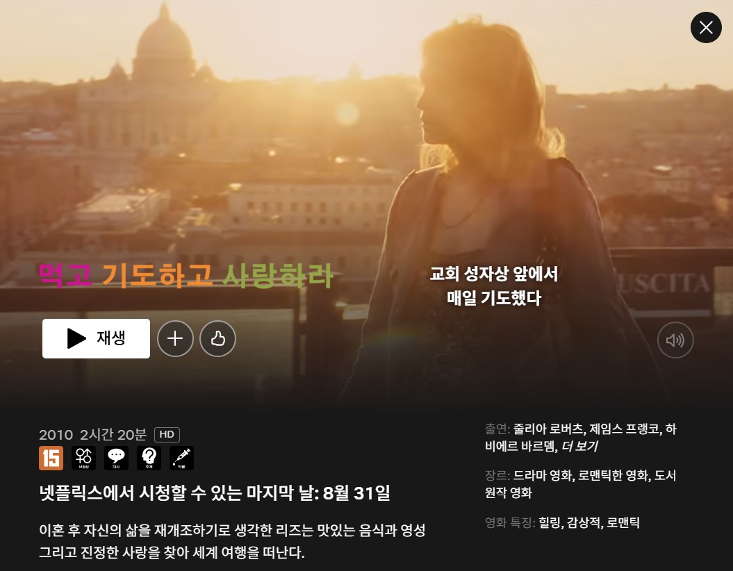 <먹고 기도하고 사랑하라>는 삶의 모든 영역에서 방향을 잃고 자신이 누구인지조차 희미해진 실존적 번아웃을 겪는 이들에게 강력한 가이드가 되어줍니다. 특히 이 영화가 제시하는 회복의 순차적 모델—몸을 먼저 돌보고(Eat), 내면을 정리한 후(Pray), 건강하게 관계 맺기(Love)—은 어디서부터 시작해야 할지 막막한 이들에게 매우 실용적이고 구체적인 로드맵을 제공합니다. 자신의 정체성이 관계와 역할 속에 매몰되어 사라졌다고 느끼는 이들에게, 온전히 자신만의 시간과 공간을 갖고 무너진 자아를 차근차근 재건해나가는 여정의 중요성을 일깨워줍니다. 이 영화는 넷플릭스에서 시청할 수 있지만 8월 31일에 종료된다고 하니 서둘러 시청하시길 바랍니다.