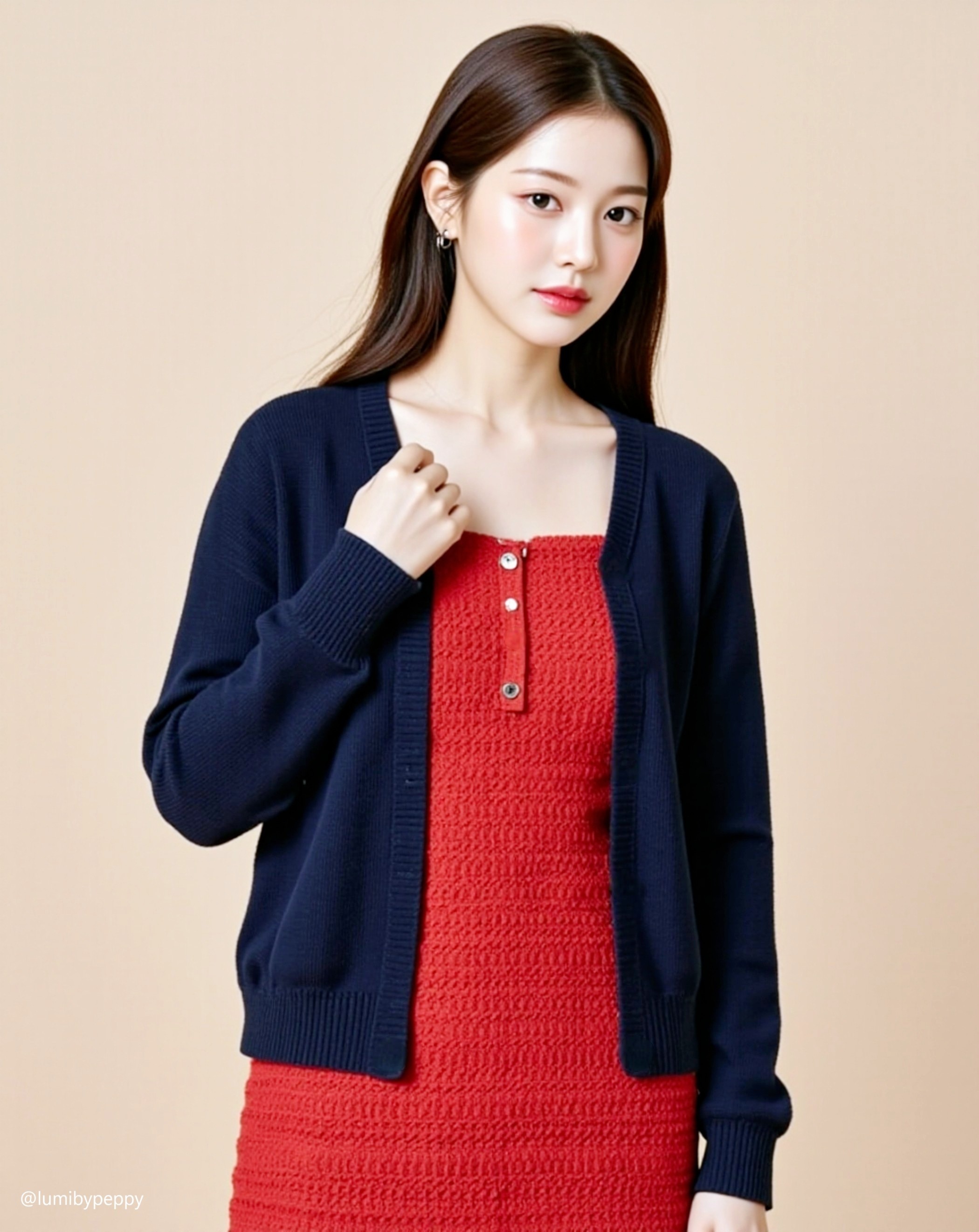 시대를 초월하는 클래식한 조합입니다. 네이비의 차분함이 체리 레드의 강렬함을 세련되게 정돈해주어, 오피스룩으로도 손색없는 지적인 룩을 완성할 수 있습니다.