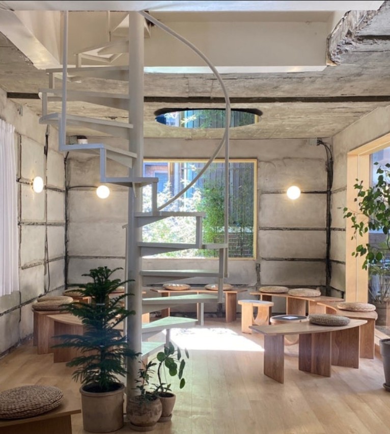 콘크리트 벽과 우드 인테리어의 조화가 인상적이며, 도심 속 조용한 정원 같은 분위기입니다.